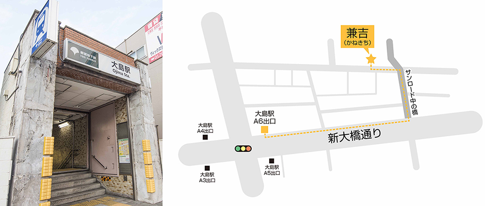 「兼吉」は都営新宿線大島駅のA6出口から左へ直進、サンロード中の橋へ折れ、一つ目の十字路を左へ曲がって少し進んだ場所にある。