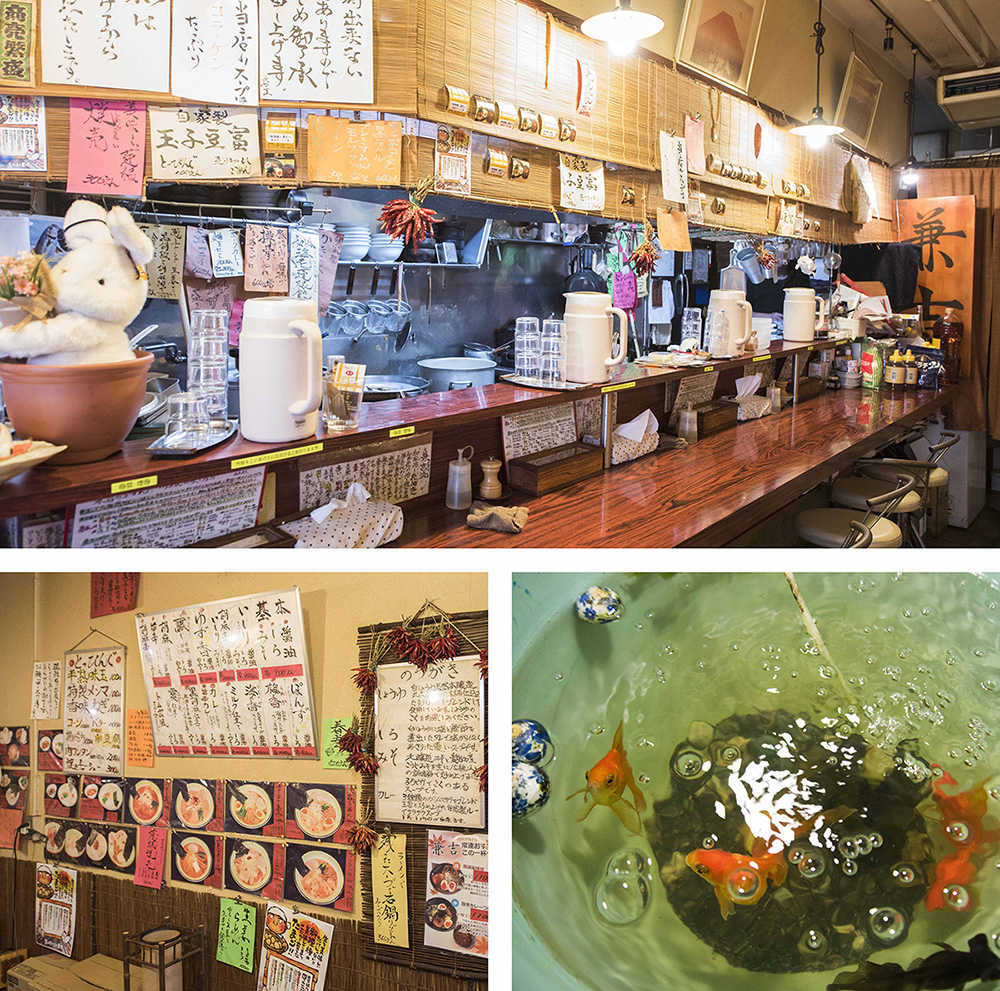 中へ入ると、店内にはところ狭しとメニューやスープについての説明書が貼られ、店主のこだわりがうかがえる。また、店内にはなぜか金魚が泳いでいる。