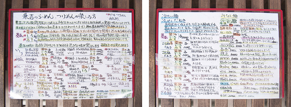 テーブルメニューだけでも下写真の情報量なので、初来店の方はどれを選んで良いか迷うことだろう。しかし、初めて「兼吉」のラーメンを食べる際には、まずは基本の「醤油」「しろ」「みそ」をシンプルに食べてみることをおすすめしたい。
