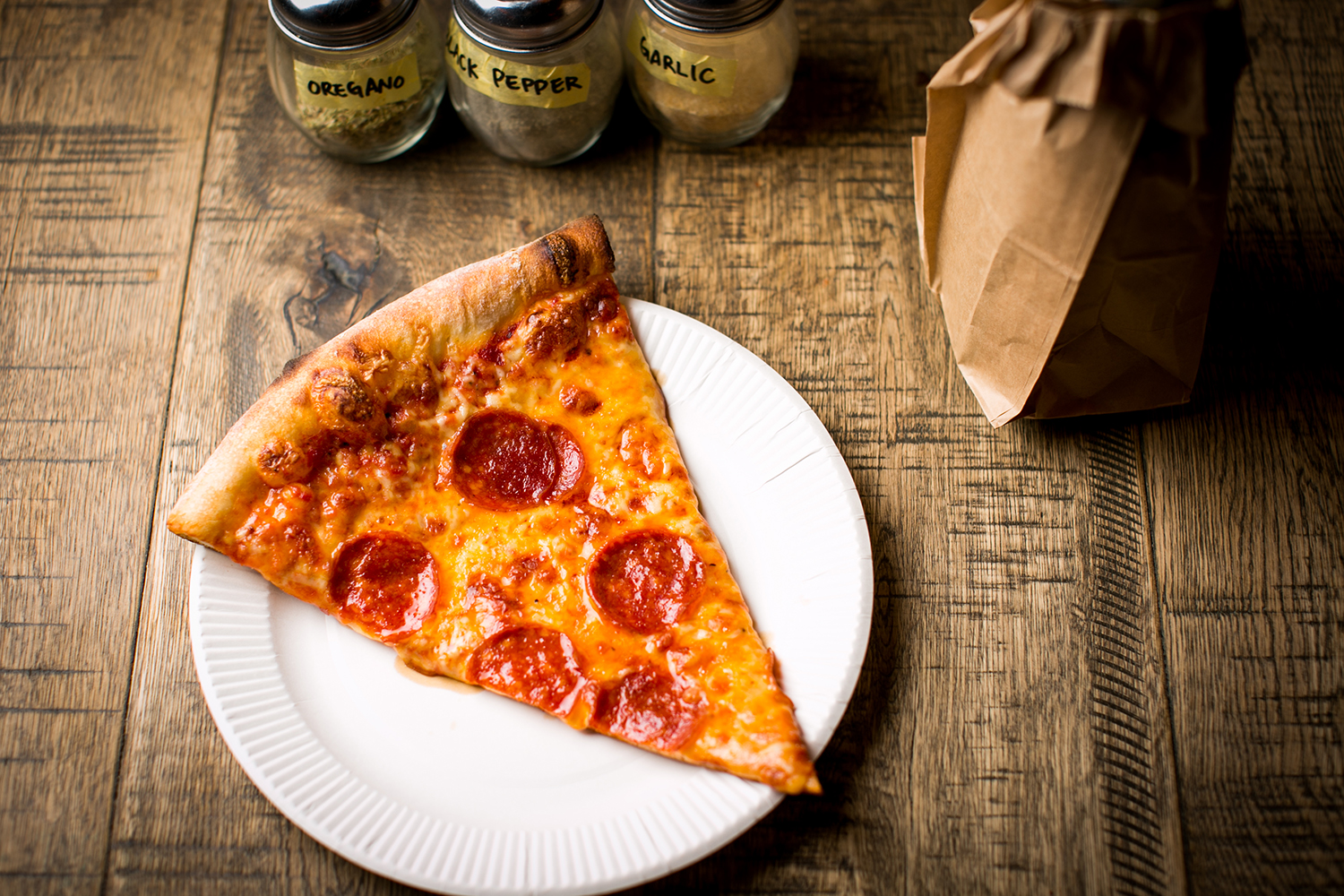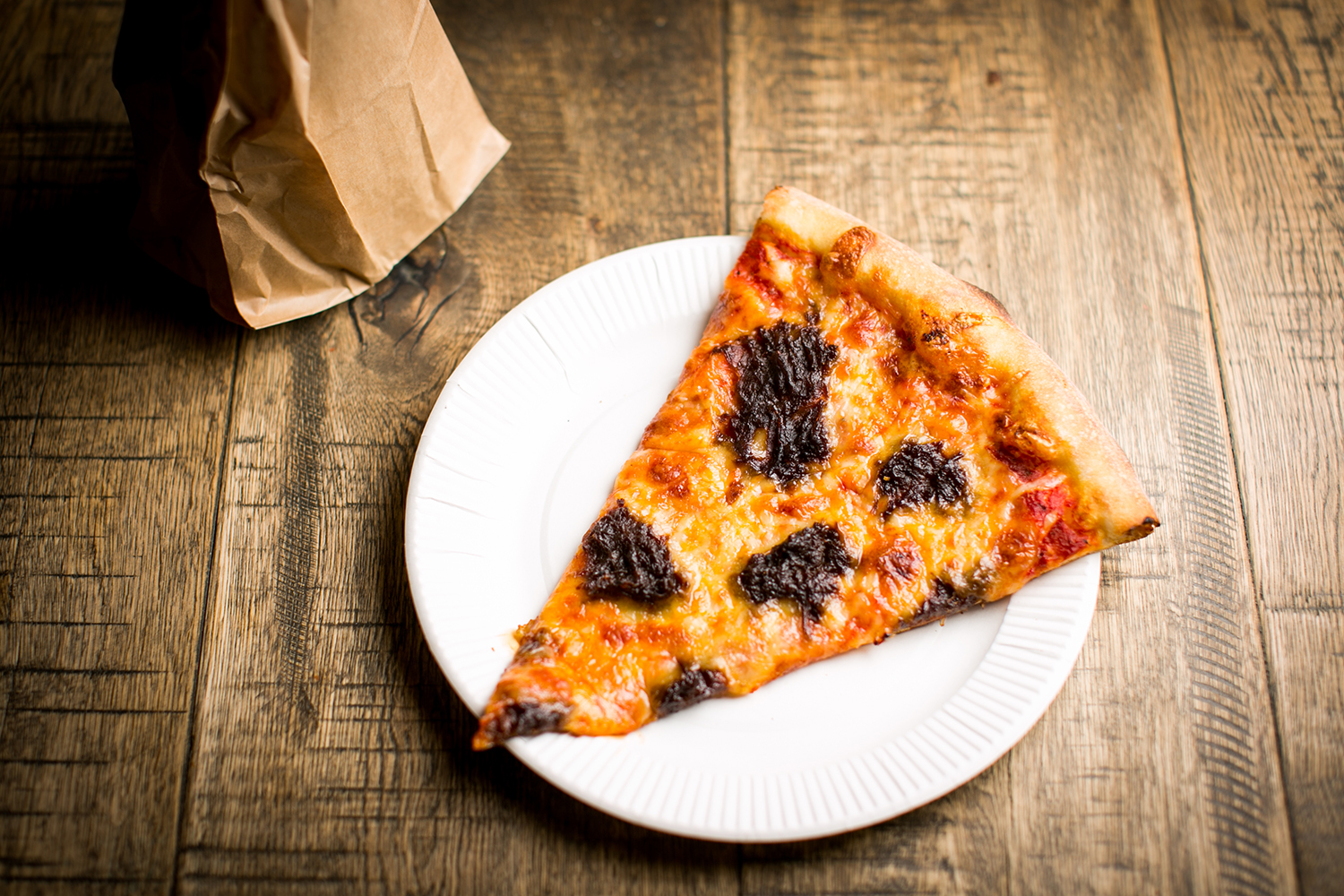 次は一番人気のペパロニスライス(500円)。チーズのベースに真っ赤なサラミソーセージが乗っている、ザ・ニューヨークピザといった感じのピザだ。これもシンプルな具材だが奥深い味わいを醸し出す。チーズだけではもの足りないといったむきにお勧め。