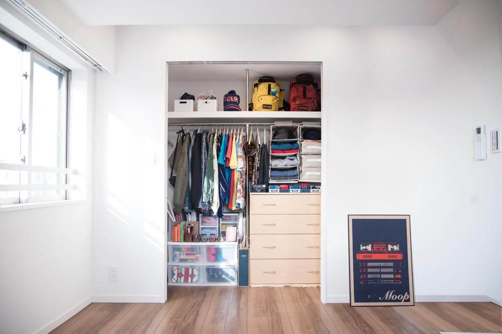 たくさん物をしまいたい時は、縦に収納することで床が広く見え、すっきりと収納できます。圧迫感が気になる方は壁と同系色の家具がおすすめ。