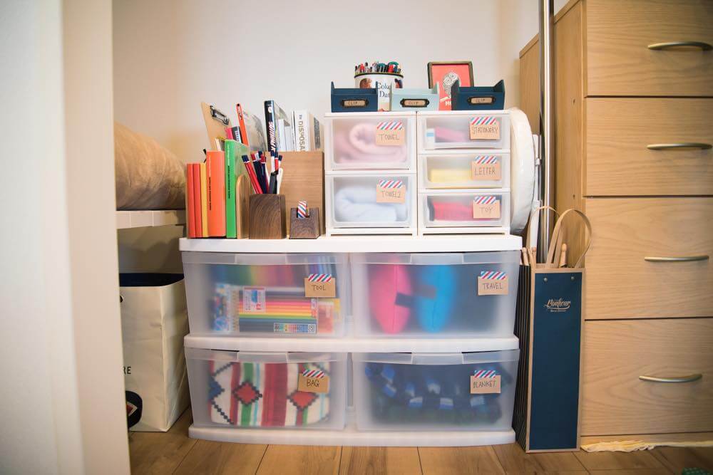 大手インテリアショップで1200円ほどで購入した商品。服だけでなく帽子や、上の写真のように箱を使って小物を片付けることもできます。