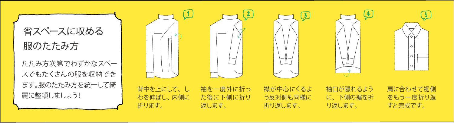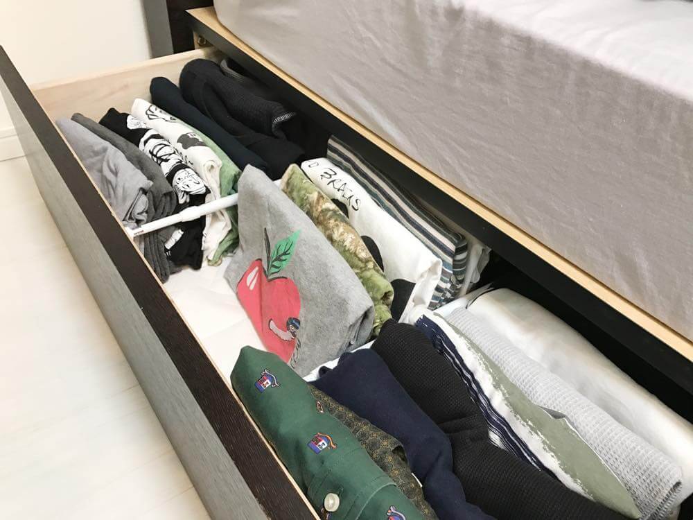 積み重ねると、着たい服を見つけるのが大変になります。また洗った物を重ねているせいで、いつまでも下に着ない服があるようにも…立てて収納すると服の種類が一目瞭然でスムーズに出し入れができます。仕切りを使って半袖と長袖を分けるのもおすすめ!