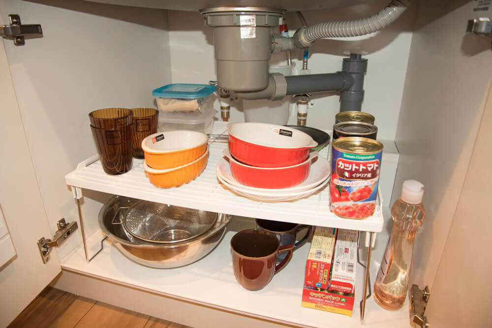 シンク下の収納スペースは、高さもあり多くの物が収納できるのに、ただ食器を高く積み上げて片付けていませんか?スペースを無駄にしないためにも、適度なサイズの棚を用いて収納することで取り出しやすいメリットもでき、快適に料理を楽しむこともできます。