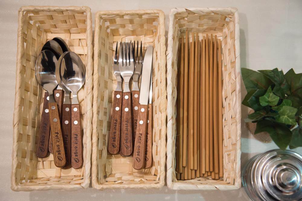 容器以外にもスプーンやフォークなどのカトラリーも同じ物でまとめると、全体の統一感がでて綺麗でおしゃれなキッチンを演出できます。すべて100円ショップで購入。