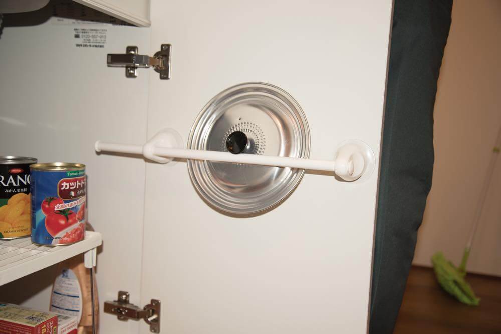 鍋の蓋などは、タオルハンガーを使ってドアの裏側に収納する方法もあります。S字フックと組み合わせて、キッチンツールを片付けることもできます。