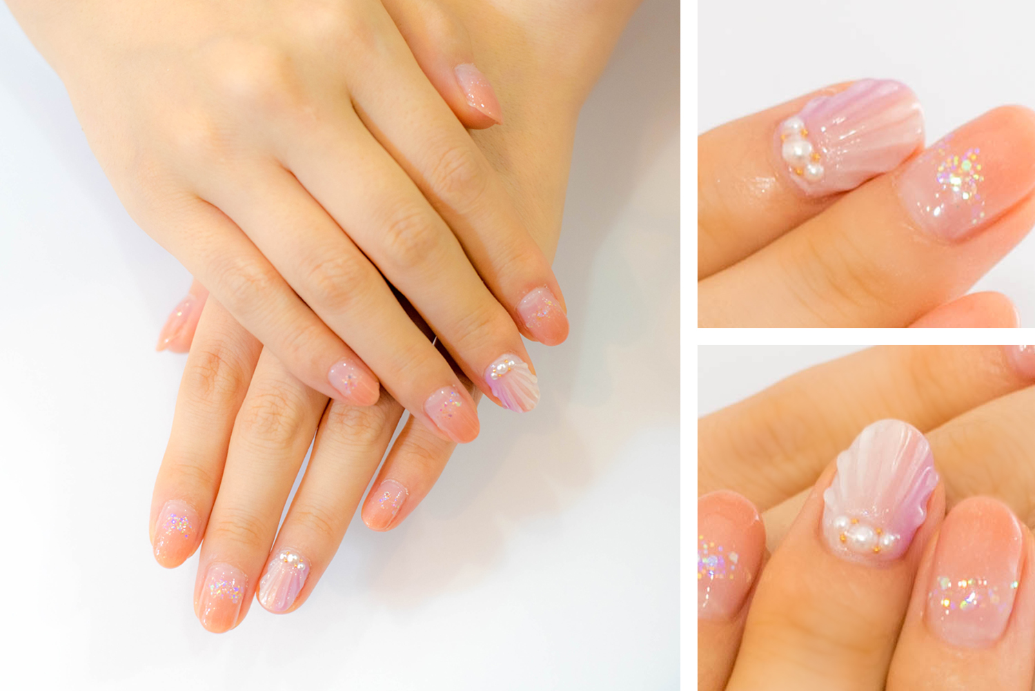 それに付随して、「マーメイドシェルネイル」として春先から人気を博したのがこのデザインだ。