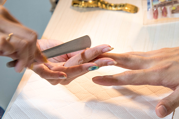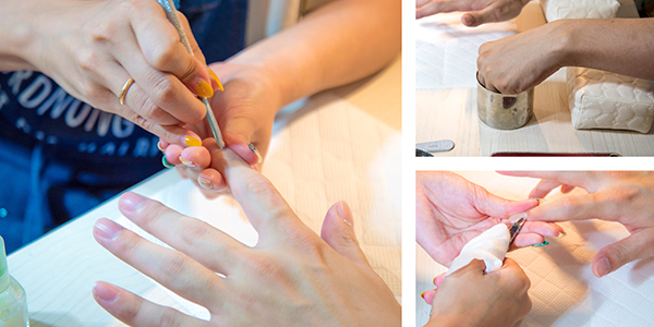 次に甘皮の処理。爪の生え際に白く溜まっている薄皮や古い角質を、ぬるま湯でふやかしてから押し上げて浮かせていきます。初めて甘皮除去をするときには痛く感じる人もいるそうですが、今回体験したスタッフは全く痛みは感じませんでした。