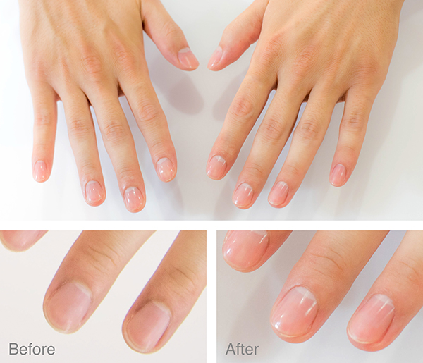 ほんのりツヤが出るまで磨いたら、爪に栄養を与えるトリートメントを塗って施術完了です。清潔感のある美しい爪になりました!